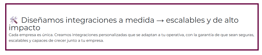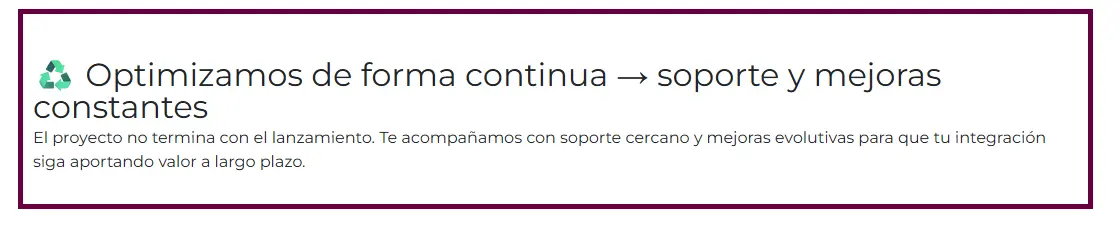 Nuestro equipo ofrece soporte continuo y optimización para que la integración siempre aporte valor y no se quede obsoleta.